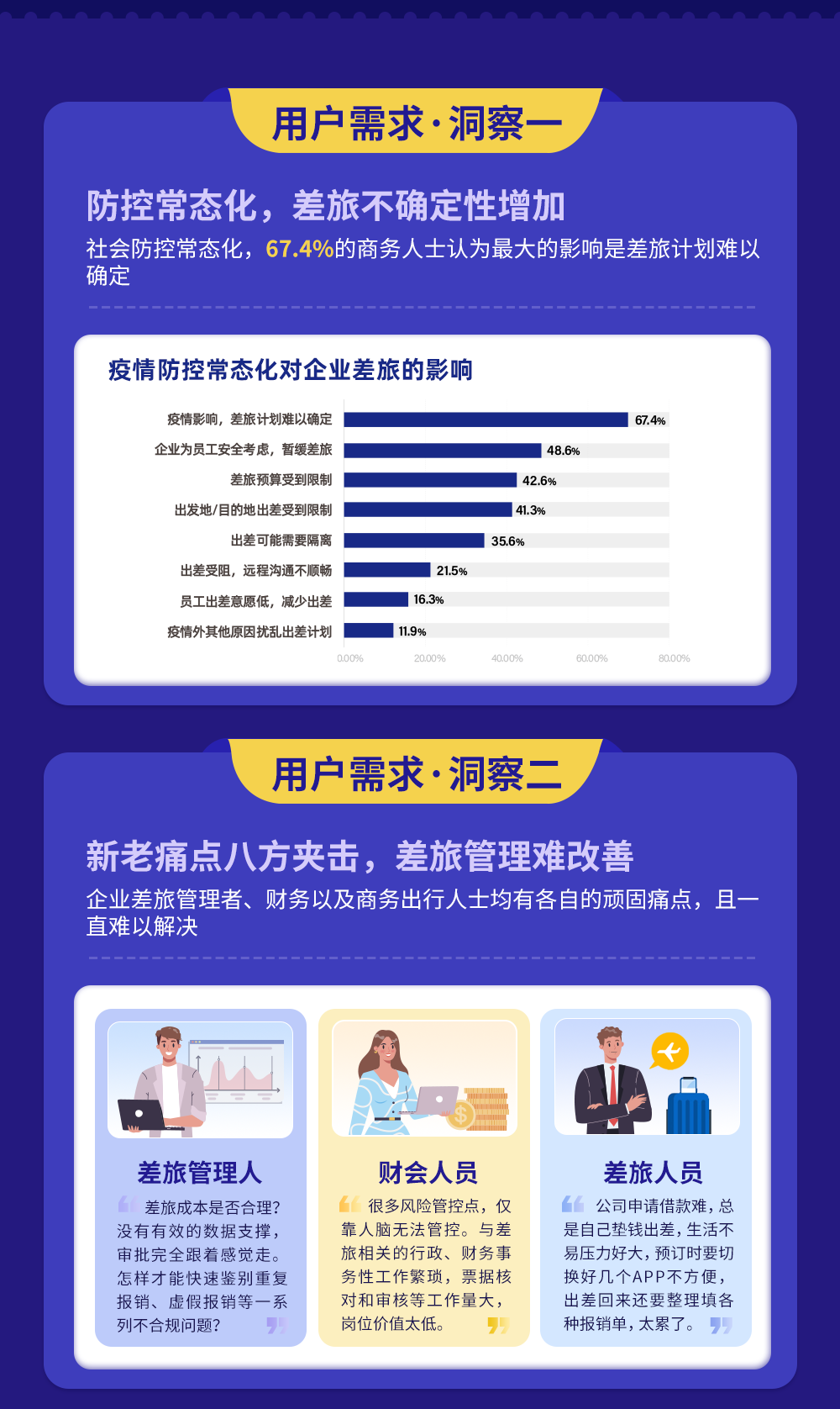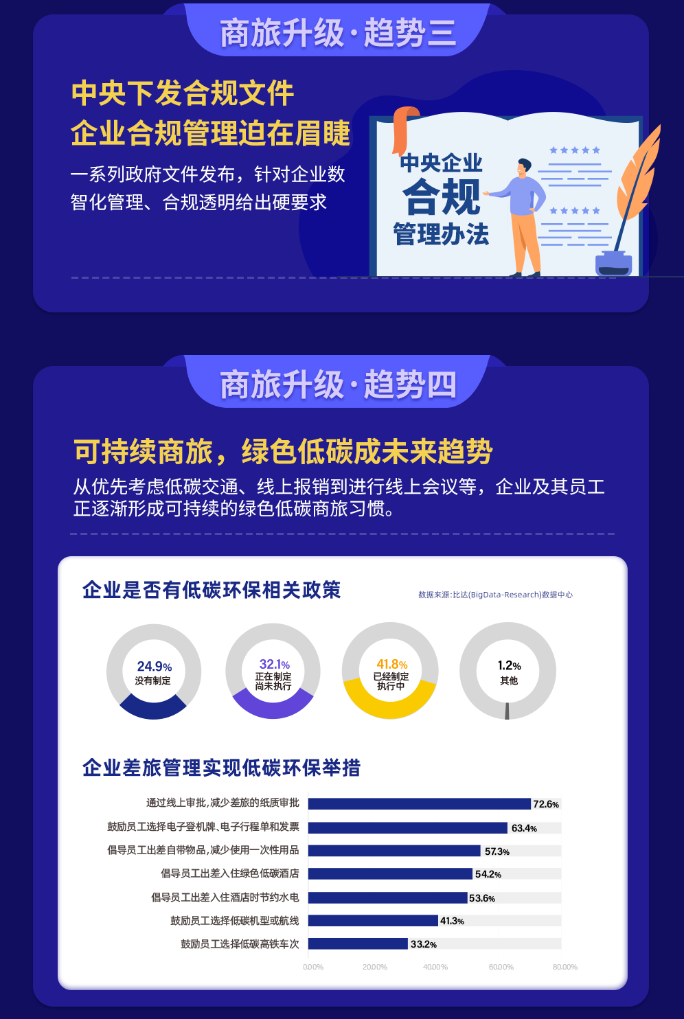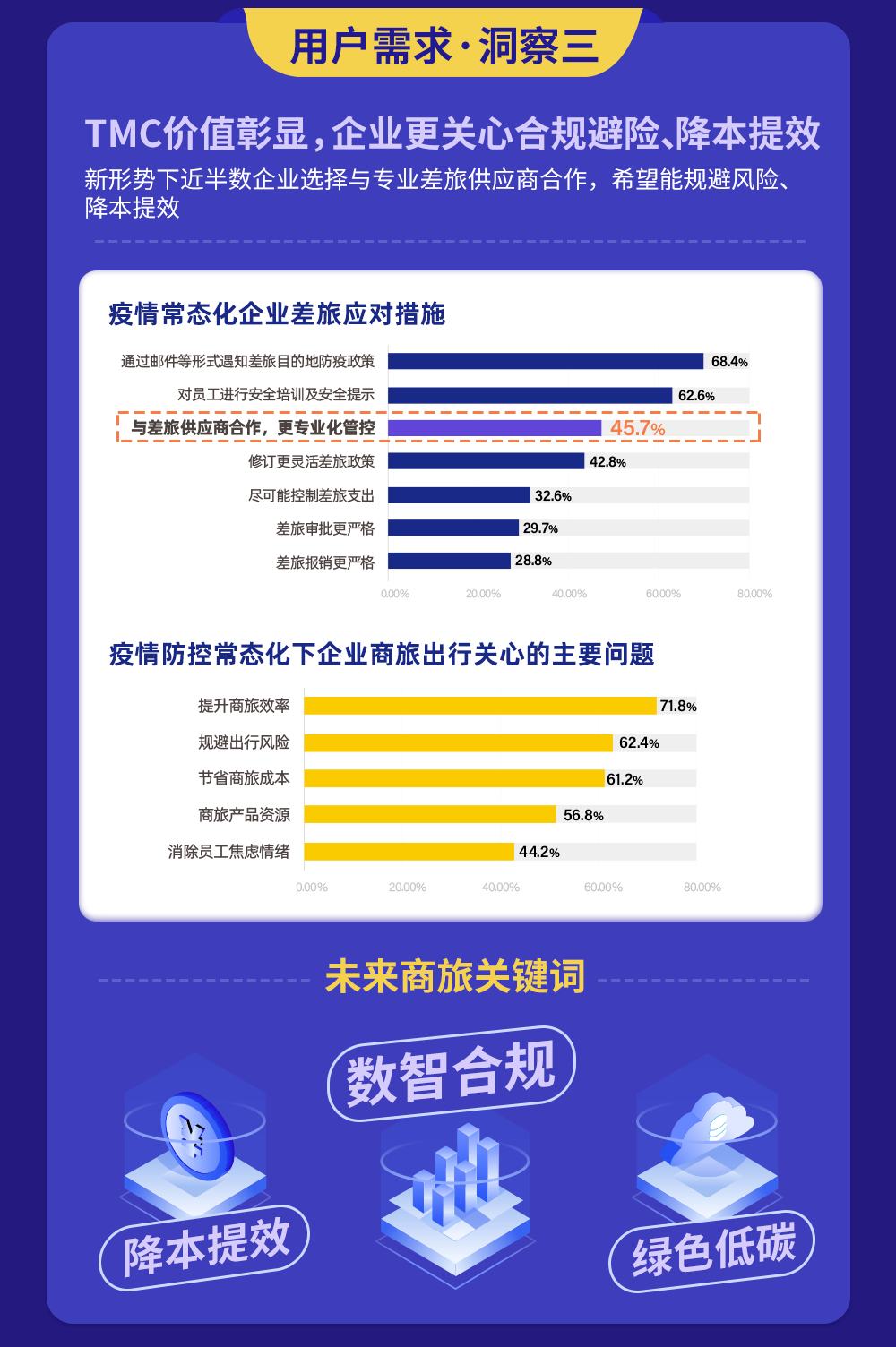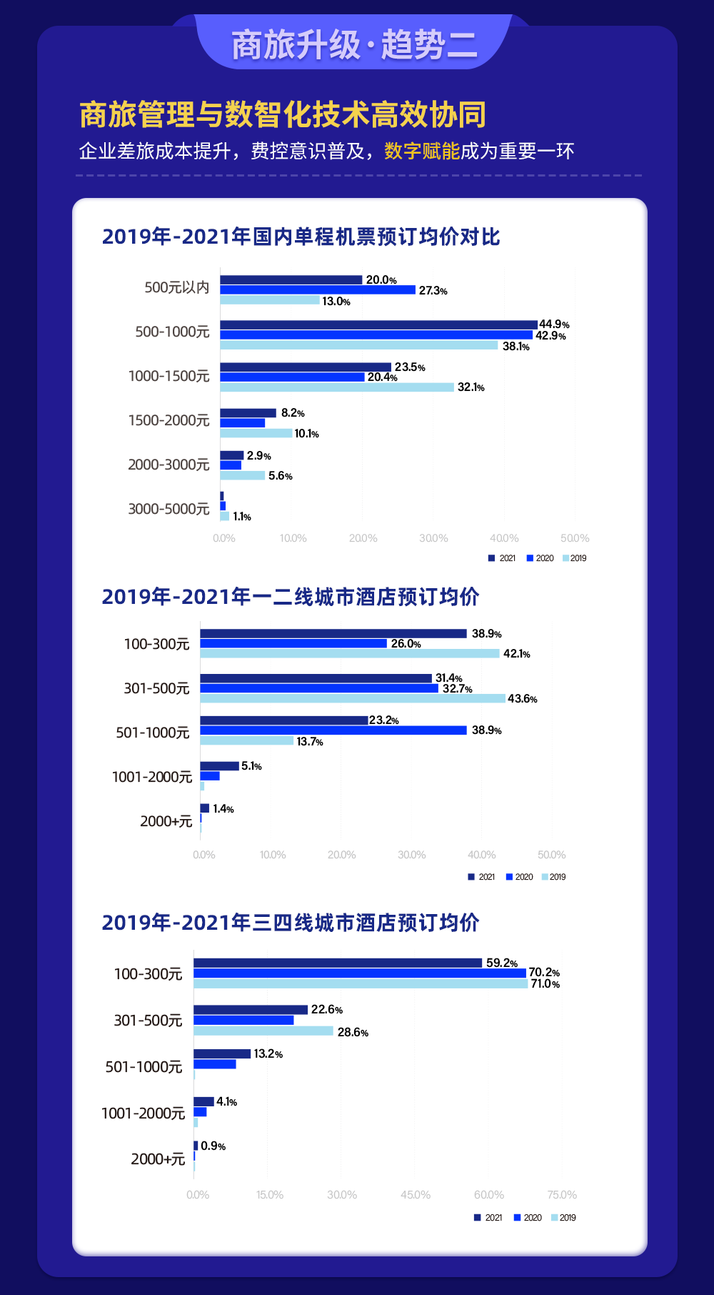 尽管新冠疫情的发生对中国商旅市场造成较大冲击,但企业的差旅需求已在逐步恢复中。“同程研究院-商旅数据中心”通过对历年数据对比发现,2021年国内单程机票预订均价在500-1000元的占比较前两年逐步提升,达到44.9%,均价在1500元以上的机票占比高于2020年,但低于2019年疫情前水平。从行业来看,房地产业和金融业的机票预订均价略高于其他行业。从酒店预订均价看,需求已基本恢复至疫情前水平。数据显示,2021年一二线和三四线城市预订均价占比最高的均集中在100-300元,从百分比数据看基本恢复至疫情前2019年水平。在商旅需求快速恢复的同时,商旅管理理念也发生了较大改变。《白皮书》认为,商旅管理已不再只是基础的商旅资源管理,更是发展成为融合商旅业务执行、费用控制、成本控制、数据分析等功能于一体的智能化、自动化、定制化、标准化的一站式数字化管理平台,数字化管理将和商旅管理高效协同。在后疫情时代,企业差旅费控意识将得到普及,而代表着专业、全链路服务的数字赋能已成为重要一环。随着疫情后商务旅行的恢复,可持续性是全球商务旅行者最关心的问题。各个企业不断重新构思和建立后疫情时代的差旅计划,从优先考虑节油航班、电动地面交通到选择虚拟会议,原有出行习惯正逐渐被改变。《白皮书》的调研样本数据显示,企业已制定或正在制定低碳环保相关政策的比例达到73.9%。在企业已实现的低碳环保举措中,主要体现在“通过线上审批减少差旅的纸质审批”、“鼓励员工选择电子登机牌、电子行程单和发票”、“减少使用一次性用品”等。除此以外,也有部分企业通过鼓励员工选择低碳机型或航线、低碳高铁车次,来实现低碳环保的目的。一连串的数据表明,将可持续发展融入到商旅计划逐渐成为全球趋势,更多企业选择将“低碳出行”理念践行到企业差旅中。针对企业的低碳商旅需求,同程商旅可围绕“低碳飞机”、“低碳酒店”、“低碳高铁”、“低碳用车”等提供一站式低碳解决方案、赋能客户低碳出行。疫情防控常态化,给企业差旅活动带来了极大不确定性。其对企业差旅的主要影响包括:差旅计划难以确定、企业为员工安全考虑可能暂缓差旅、差旅预算受到限制等。《白皮书》调研发现,疫情常态化下,提高商旅效率、降低出行风险和控制商旅成本是当前企业最关心的问题。而结算合规便捷、较快的响应速度和24小时客户服务是影响企业选择差旅供应商的最主要因素。企业商旅管理需求则集中在合规、节流、提效和员工满意度四个方面。围绕这些需求,商旅服务供应商需从资源、系统和服务商三个层面进行能力的构建。调研还发现,各类型企业商旅管理需求有所区别,相比较而言,央国企商旅管理的主要需求是 “规范管理,合规透明”和“降低差旅成本”,占比分别是59.2%和55.2%;外企的“提高效率”需求排第一,而民营企业和中小企业的“降低差旅成本”需求排在首位。《白皮书》的一项调查结果显示,50.9%的企业表示今年的差旅费预算同比2021年增长20%以上。而中国企业差旅费用中隐性成本占80%,显性成本占20%,急需通过有效的管理和控制手段来降低成本。经过测算,企业实施商旅管控后,包括交通、住宿等硬性成本和税务等财务成本在内的显性成本节约超过10%。而包括审批、贴票、报销等环节的时间成本、人力成本、沟通成本等隐性成本的流程效率大幅提升65%以上,尽管增加了少量差旅服务采购成本,但总体差旅成本依然节省超30%。同程商旅以整合企业差旅、费控、OA系统、支付、报销为一体,可为企业提供商旅服务新标准,助力企业实现消费支出合规透明、降本增效,提升员工满意度。数据显示,同程商旅通过数智化管理手段为企业差旅成本优化30%,告别线下报销流程后财务人效提高40%,进行合规管控后企业风险减少90%。此外,同程商旅不仅对企业管理所需的基本功能做了全面深度覆盖,还通过独有的特色数智化合规平台为行业提供新的服务模式,最终为企业前置识别不合规行为,做到有效预警、规避风险。