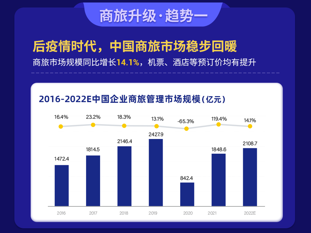 《白皮书》数据显示,疫情对中国商旅市场影响明显,但随着国内经济稳定复苏以及国内疫情基本得到有效控制,预计2022年中国商旅管理市场在2021年的基础上继续回暖,市场规模预计达2108.7亿元,同比增长14.1%。