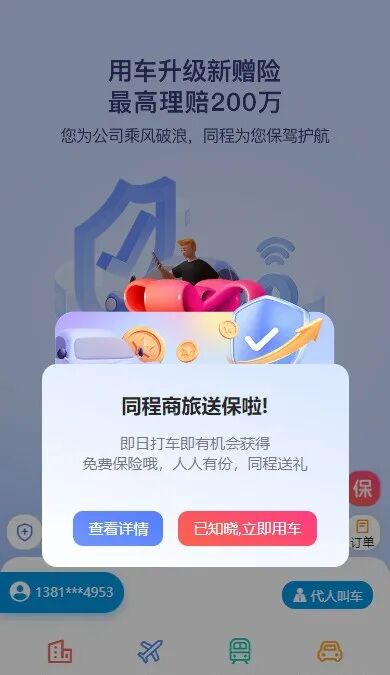 今年10月,Z先生所在单位和同程商旅达成合作,企业员工可以在同程商旅平台一站式完成出差审批、机酒火用车预订、公对公支付等流程,而且因公因私都能用,用车时还能免费领意外险。